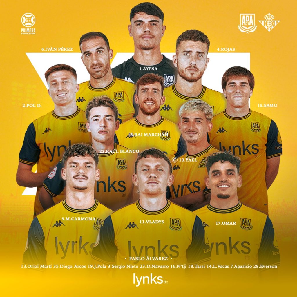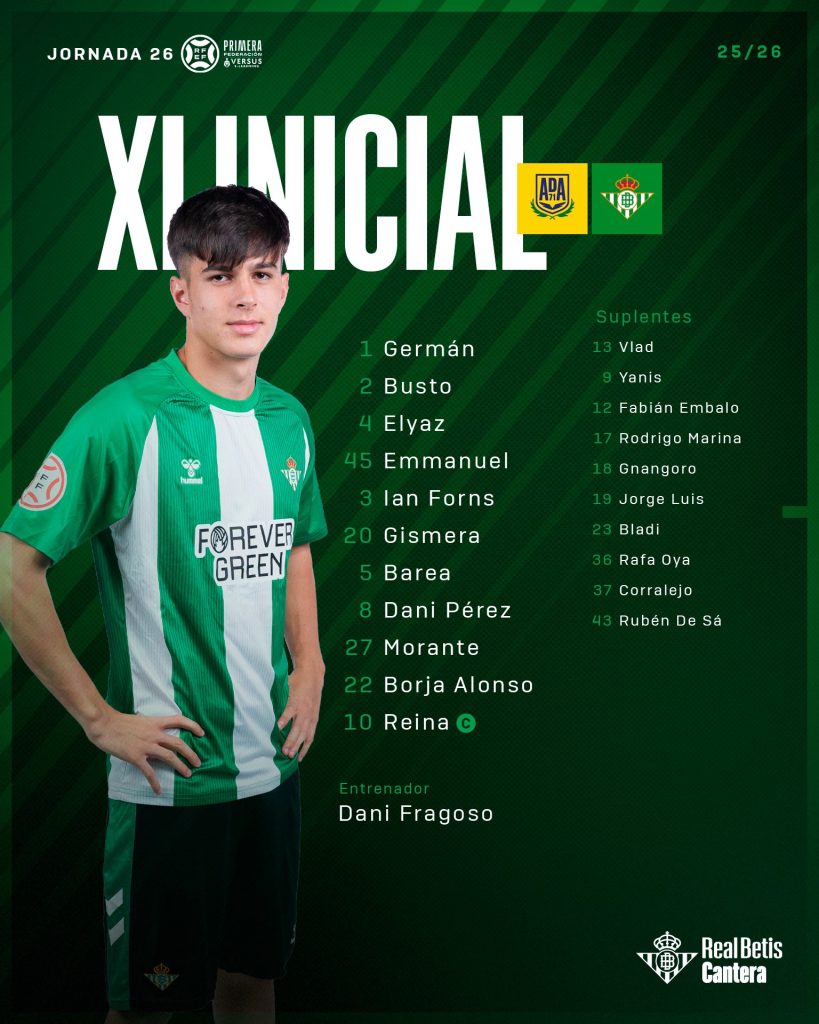 BETIS DEPORTIVO (4-3-3): Germán; Pablo Busto, Elyaz, Emmanuel, Ian Forns; Gismera, Barea, Dani Pérez; Morante, Borja Alonso y Carlos Reina.
