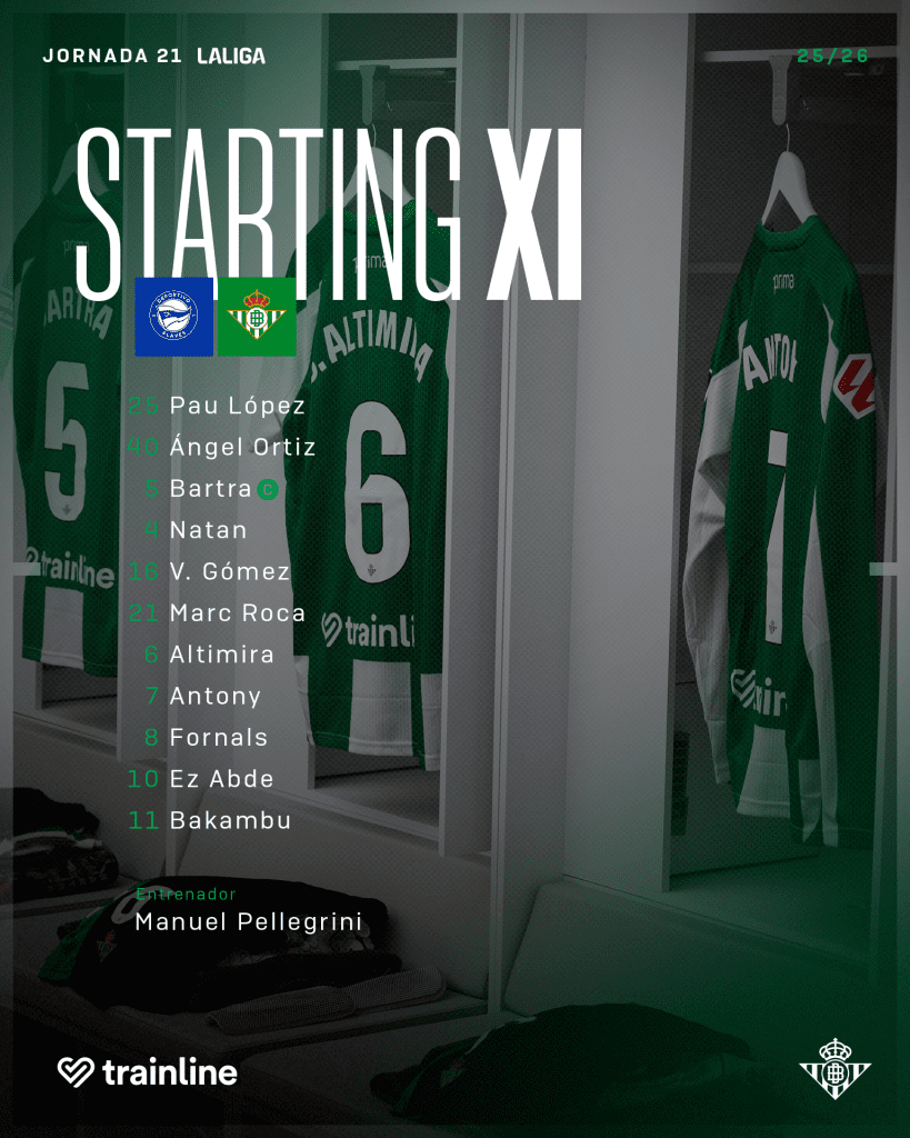 Las 8 ausencias béticas han dado lugar a una convocatoria raquítica (tan solo han viajado 19 futbolistas) y a una alineación previsible. El Ingeniero apostó por Pau López en vez de Álvaro Valles como portero (única sorpresa); Ángel Ortiz, Bartra, Natan y Valentín Gómez en una línea de cuatro; un doble pivote -catalán- formado por Altimira y Marc Roca; Antony, Fornals y Abde por delante y el congoleño Bakambu, con un pie fuera de La Cartuja, como punta.