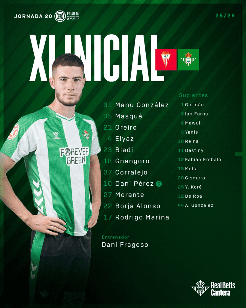 El equipo bético acumuló posesión y pases, hasta 494 en el cómputo final, pero le costó transformar ese control en ocasiones claras. Morante y Rodrigo Marina buscaron desmarques constantes, mientras Borja Alonso intentó generar desequilibrio desde banda, aunque la defensa local se mostró firme y bien escalonada. Manu González, por su parte, sostuvo al equipo con varias intervenciones, manteniendo el marcador ajustado al descanso.