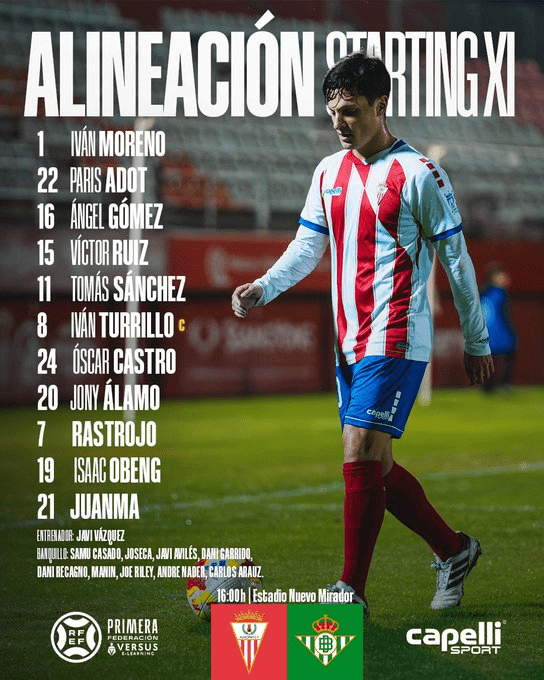 Algeciras C.F. (4-2-3-1): Iván Moreno; José Carlos, Ángel Gómez, Víctor Ruiz, Tomás Sánchez; Castro, Iván Turrillo; Obeng, Jony Álamo, Rastrojo y Juanma García