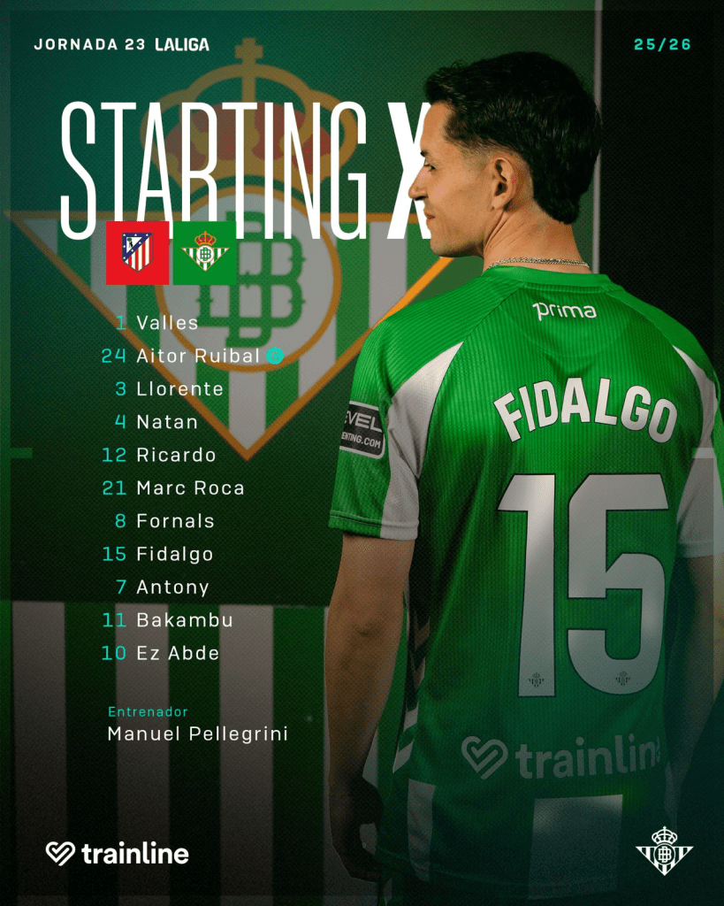 Manuel Pellegrini sorprendía en esta jornada ligera cambiando, aparentemente, la formación, alineando el sistema 4-3-3. Vuelta a la titularidad de Valles en la portería, en defensa rota la parte izquierda (Bartra y Valentin Gomez por Natan y Ricardo). Con un pivote como Marc Roca y dos volantes en el medio campo organizando el juego; Fornals y Fidalgo, el cual debutaba como titular. Arriba presentaba las bandas mas adelantadas y ofensivas con los habituales Abde y Antony y como referencia en la punta, Bakambu.