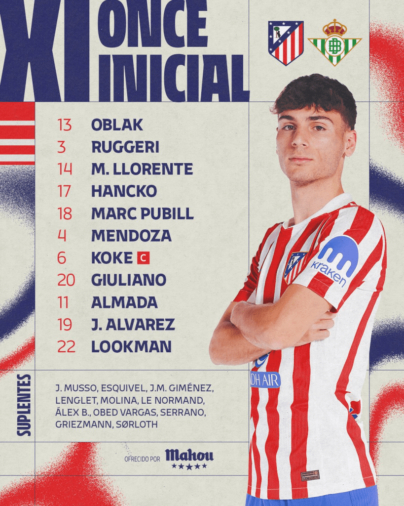 El conjunto del Cholo Simeone presentaba rotaciones respecto al partido de entre semana. Vuelta a portería para Oblak, en defensa no cambiaría nada respecto al partido de Copa del Rey, jugando Marcos Llorente, Hancko Ruggeri y Pubill. Tras las molestias de Barrios, entraría como titular Rodrigo Mendoza, haciendo su debut delante de su nuevo público. En la zona ofensiva saldría del once Baena y Griezmann para dar entrada a Almada y Julián Alvarez, y completando el once con Lookman.