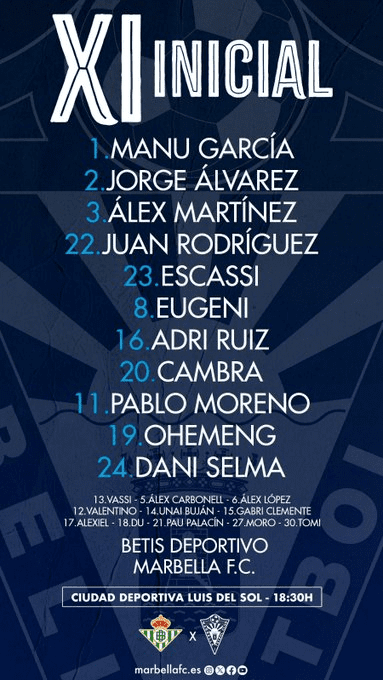 Marbella F.C. (4-2-3-1): Manuel García; Jorge Álvarez, Escassi, Juan Rodríguez, Alejandro Martínez; Eugeni, Adrián Ruiz; Ohemeng, Cambra, Moreno y Selma.