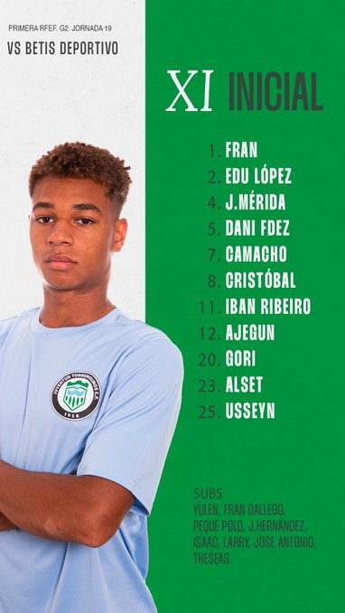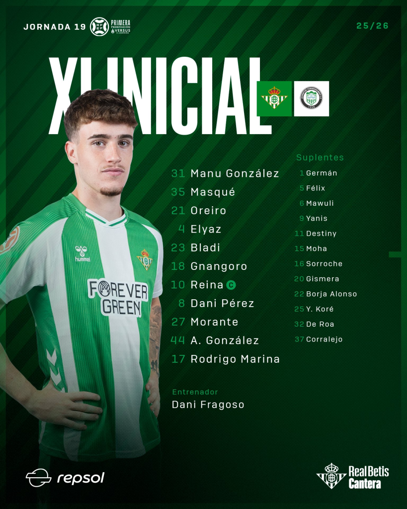BETIS DEPORTIVO (4-3-3): Manu González; Óscar Masqué, Oreiro, Elyaz Zidane, Bladi; Gnangoro, Carlos Reina, Dani Pérez; Antonio González, Morante y Rodrigo Marina.