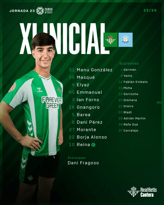 BETIS DEPORTIVO (4-3-3): Manu González; Óscar Masqué, Emmanuel, Elyaz Zidane, Ian Forns; Gnangoro, Barea, Dani Pérez; Morante, Borja Alonso y Carlos Reina.