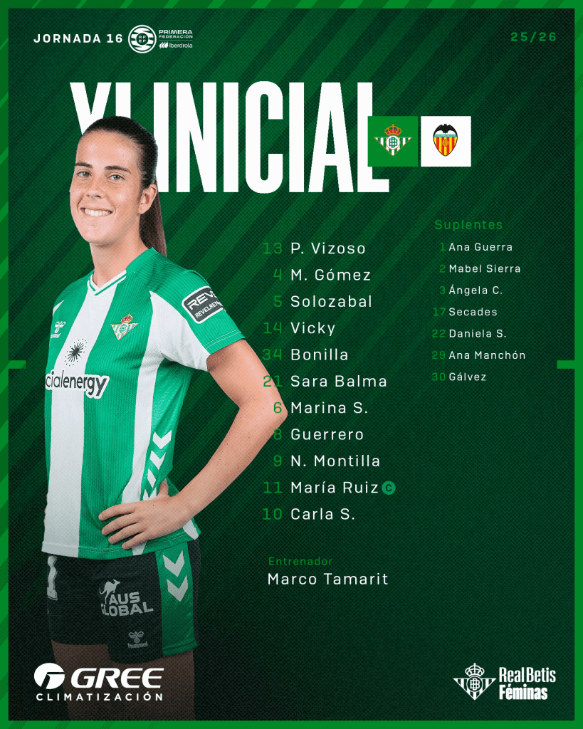 El Betis Féminas alineó el siguiente once para enfrentarse al Valencia Femenino en este partido con aroma a Liga F.