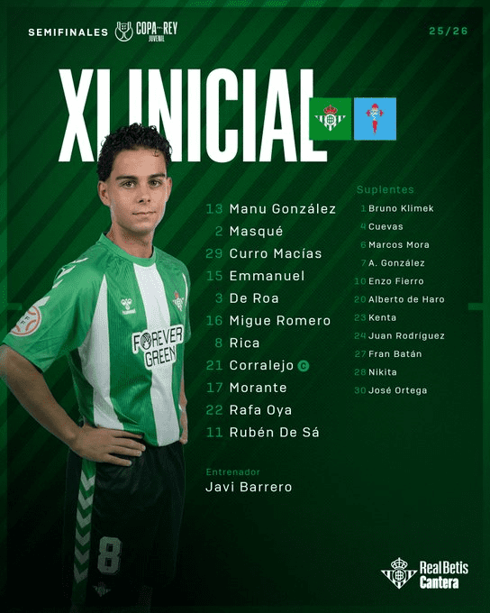 La gran final de la Copa del Rey Juvenil se disputará el domingo 15 de marzo a las 11:45 horas, nuevamente en el Estadio Anxo Carro, donde el Betis buscará culminar su espectacular camino en el torneo con el título.