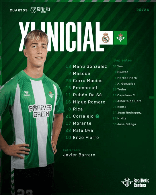 Real Betis: Manu González; Ruben de Sá, Emmanuel, Curro Macías, Masqué; Migue Romero, Rica; Rafa Oya, Corralejo, Morante; Enzo Fierro.