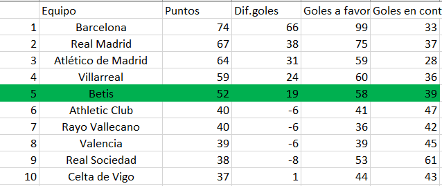Según los cálculos publicados por el analista de datos y matemático Fran Martínez, basados en un modelo de predicción con 100.000 simulaciones, el Betis tiene actualmente un 56,12% de probabilidades de acabar quinto, mientras que el RC Celta alcanza un 30,67% tras su victoria en Mestalla y la Real Sociedad se queda en un 8,81%.