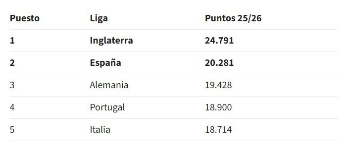 En este momento LaLiga ocupa la segunda posición del ranking UEFA con 20.281 puntos, solo por detrás de Inglaterra, que lidera con 24.791, mientras que Alemania es tercera con 19.428. Si España mantiene esa posición entre las dos primeras ligas del ranking, la quinta plaza del campeonato español dará acceso a la próxima edición de la Champions League.