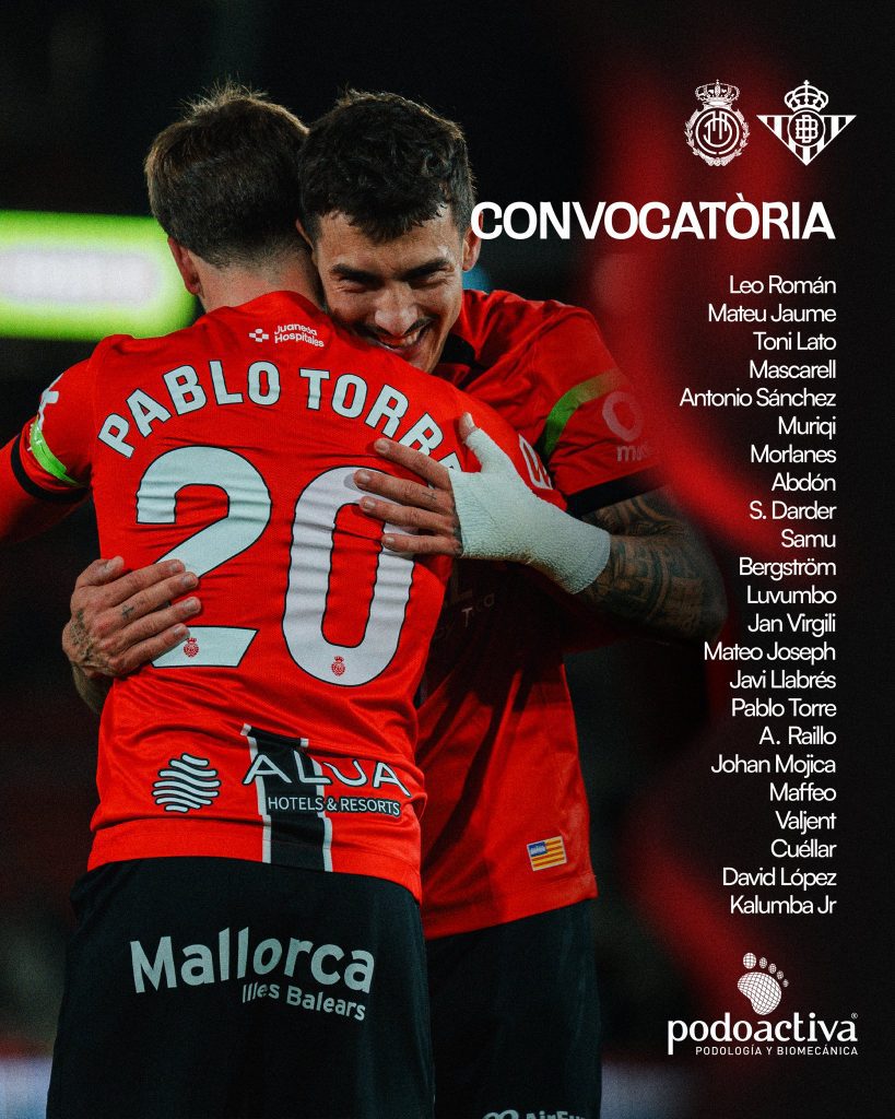 La convocatoria del conjunto bermellón está formada por: Leo Román, Mateu Jaume, Lato, Omar Mascarell, Antonio Sánchez, Muriqi, Morlanes, Abdón, Sergi Darder, Samu, Bergström, Luvumbo, Jan Virgili, Mateo Joseph, Javi Llabrés, Pablo Torre, Raíllo, Mojica, Maffeo, Valjent, Cuéllar, David López y Kalumba Jr.