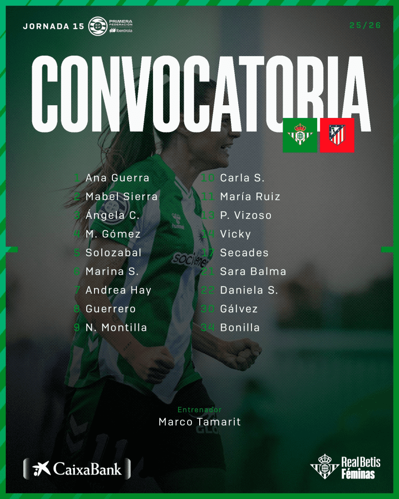 En esta ocasión, Marco Tamarit realiza dos cambio respecto a la convocatoria de la jornada pasada. Siendo la introducción de María Ruiz y Secades como novedad, la que se cae de dicha lista es la canterana Ana Manchón y la marroquí Zouhir.